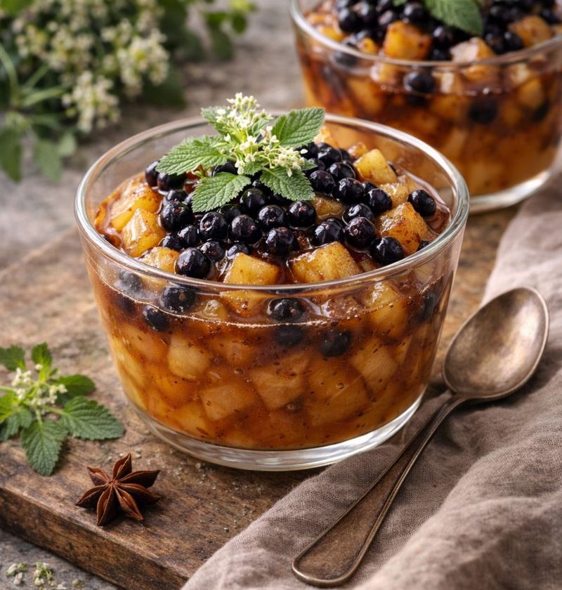 Vlierbes–appel dessert met specerijen en melganzenvoet